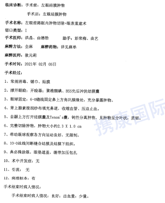 为了切除肿瘤及明确病理性质,2021年2月6日对该患儿实施了【左眼前路眶内中物切除+眼表重建术】。