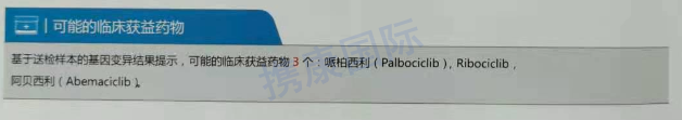 2021年4月9日经基因检测报告提示 :可能的临床获益药物3个:哌柏西利(Palbociclib),Ribociclib,阿贝西利(Abemaciclib)。