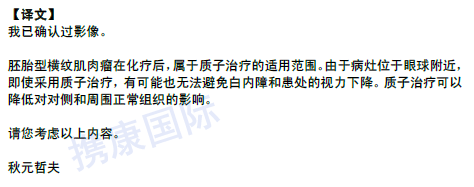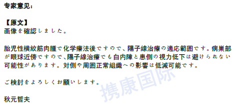 2021年5月26日,经过我司对该患儿病历的整理、翻译后,直接问诊秋元哲夫教授,并得到适合质子治疗的回复。