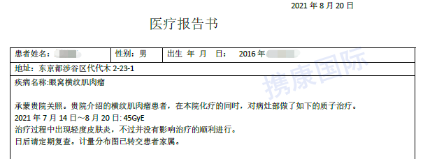 通过国内诊断及治疗后,主治医生建议针对该患儿的病情进行术后、化疗后的放射治疗。由于患儿年纪较小,家属考虑到普通放疗给孩子将来带来的副作用以及治疗效果等问题,经过多方咨询,最终联系到我司,希望咨询日本国立癌症中心东医院副院长秋元哲夫教授,关于质子放疗方面的问题。