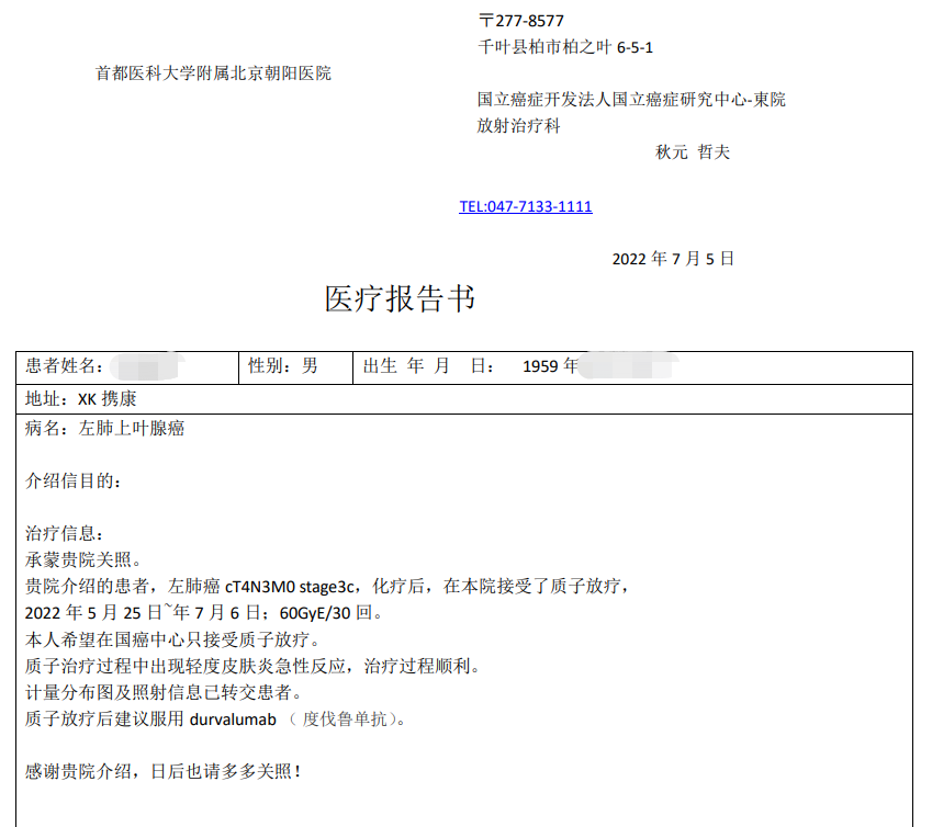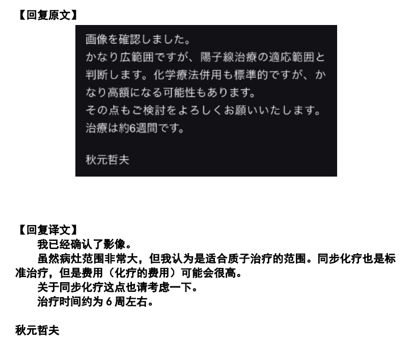 2022年4月12日经日本国立癌症研究中心东医院秋元哲夫教授会诊回复: