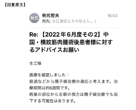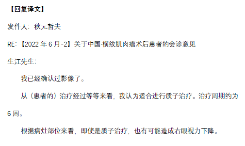 2022年6月15日经日本国立癌症研究中心东医院秋元哲夫教授的会诊回复: