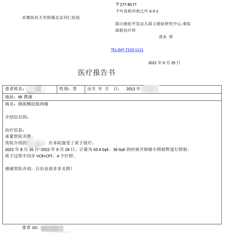 在日本国立癌症研究中心东医院,通过对患儿进行质子治疗前的检查、定位、制作模具等流程。于2022年8月16日至2022年9月28日接受了50.4GyE的质子放疗,并同步VCR+CPT化疗4疗程。