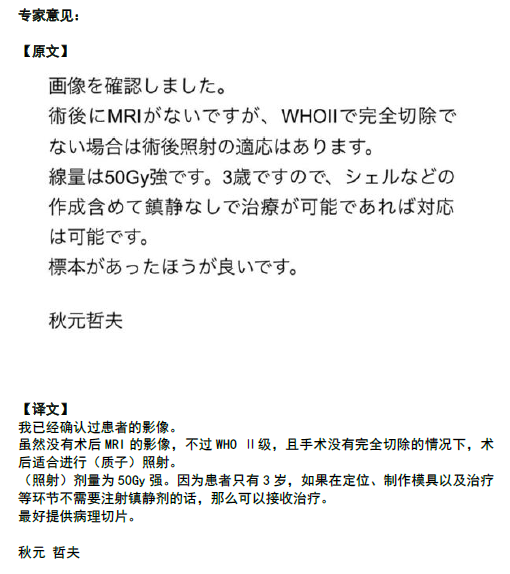 2020年10月21日:通过与日本国立癌症研究中心东医院秋元哲夫教授,关于质子治疗的会诊回复: