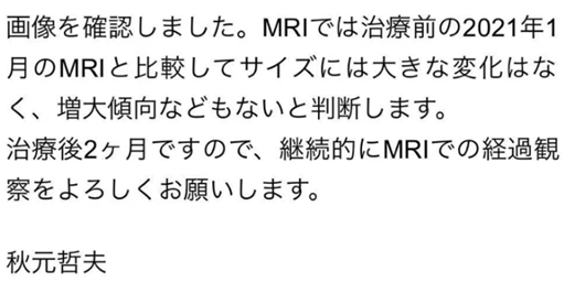 与2021年1月治疗前的MRI影像相比较,病灶没有大的变化,并且没有增大倾向。因为治疗结束后刚刚2个月,所以请继续定期复查MRI检查。
