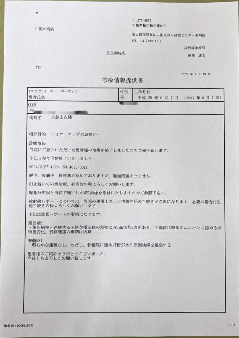 2024年1月19日经日本国立癌症研究中心东医院:秋元哲夫教授会诊回复: