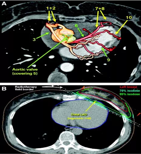 乳腺癌治疗后,放射引发的Berrington de Gonzalez, et al. 估算出乳腺癌照射后,5%的对侧乳腺癌发生继发性癌症 。杜克大学的Prosnitz 等人 采用SPECT进行灌注研究。它表明在左侧乳腺癌X线照射一段时间后, 心脏的新灌注缺陷显著增高。 左心房照射面积越多,灌注缺陷发病率越高。