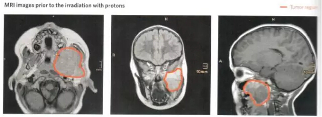 颅咽管瘤是一种儿童脑肿瘤, 肿瘤完全切除有治愈的希望,但是只有50-80%的患者可以接受手术完全切除,但即使完全切除仍有一部分患者可能复发。此外,有10%的手术患者存在视觉损伤等。在这些敏感部位,质子可以进行治疗。
