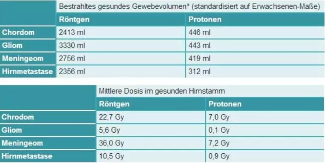在一项对光子治疗和质子治疗进行比较的研究中,在对3岁7个月大的男孩实施质子治疗的案例中,发现内耳的暴露剂量可以从 100% 降至 2.4% ,脑垂体由62%降至 0.1% ,心脏的暴露剂量由18%降至0.1%。 洛玛连达大学一项关于儿童颅内肿瘤质子束放疗的耐受性试验也支持了这个结果。