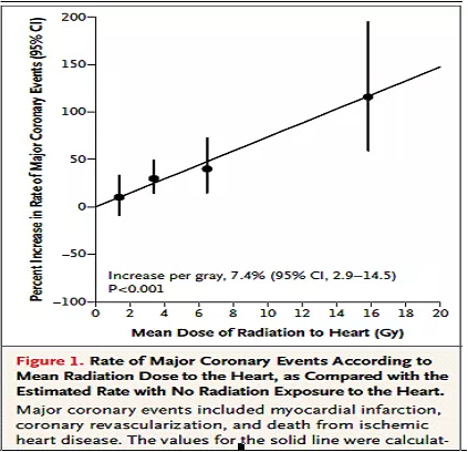 Nilsson等人的研究表明,2168位妇女在1958年到2001年间曾接受X线技术治疗 ,963位妇女发生主冠状动脉事件(MCE) 由于心脏的中位剂量在无明显界值下每格瑞增高7.4%,不良事件发生率直线增高。