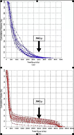 14位患者的(a)调强适形放疗和(b)三维适形放疗计划的心脏剂量分布图。 尽管,对于剂量大于30Gy的治疗调强适形放疗的心脏剂量是最小的,但与三维适形放疗计划相比,平均和中位心脏剂量却升高了。